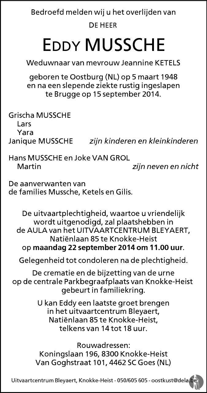 Eddy Mussche 15 09 2014 Overlijdensbericht En Condoleances Mensenlinq Nl
